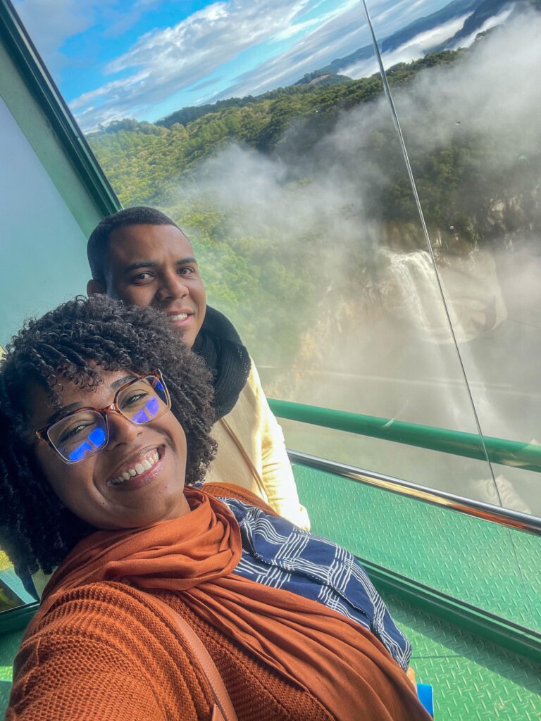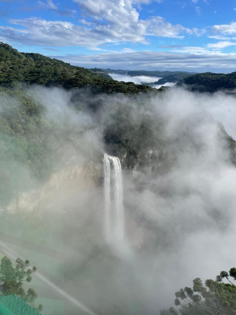 Depois seguimos para o Parque do Caracol, em Canela. A grande estrela do lugar é a Cascata do Caracol, uma das mais lindas da região. No dia da nossa visita, uma neblina cobria o cenário, mas ainda conseguimos alguns registros e momentos especiais por lá. O parque em si é muito bonito e oferece um circuito agradável em meio à natureza, com trilhas, mirantes e ar puro.